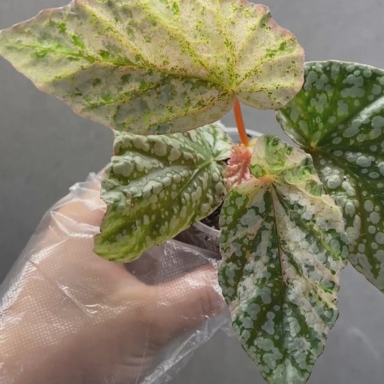 A beautifully variegated Snow Cap with creamy white, mint, and light green marbling dusted in silver spots. Each leaf looks like a frozen watercolor painting — elegant and serene. 🌿✨