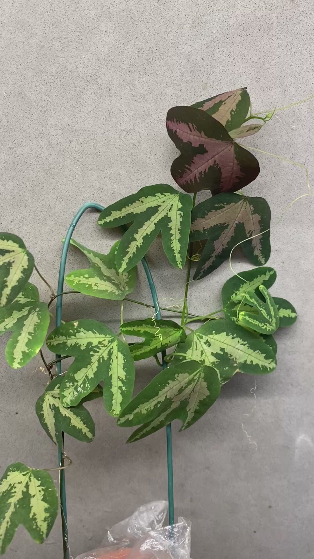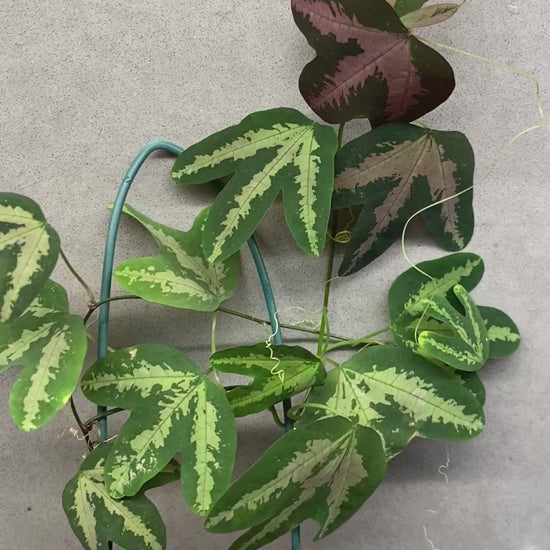 🌿 Assiflora trifasciata (Duck Feet Vine)A rare and stunning passion vine with tricolor variegation — olive green, soft pink, and cream streaks beautifully contrast on each lobed leaf. Fast-growing and easy to trail or trellis, perfect for adding color and structure to your space. 🪴 Well-rooted, long trailing vine 💡 Bright indirect light, enjoys humidity