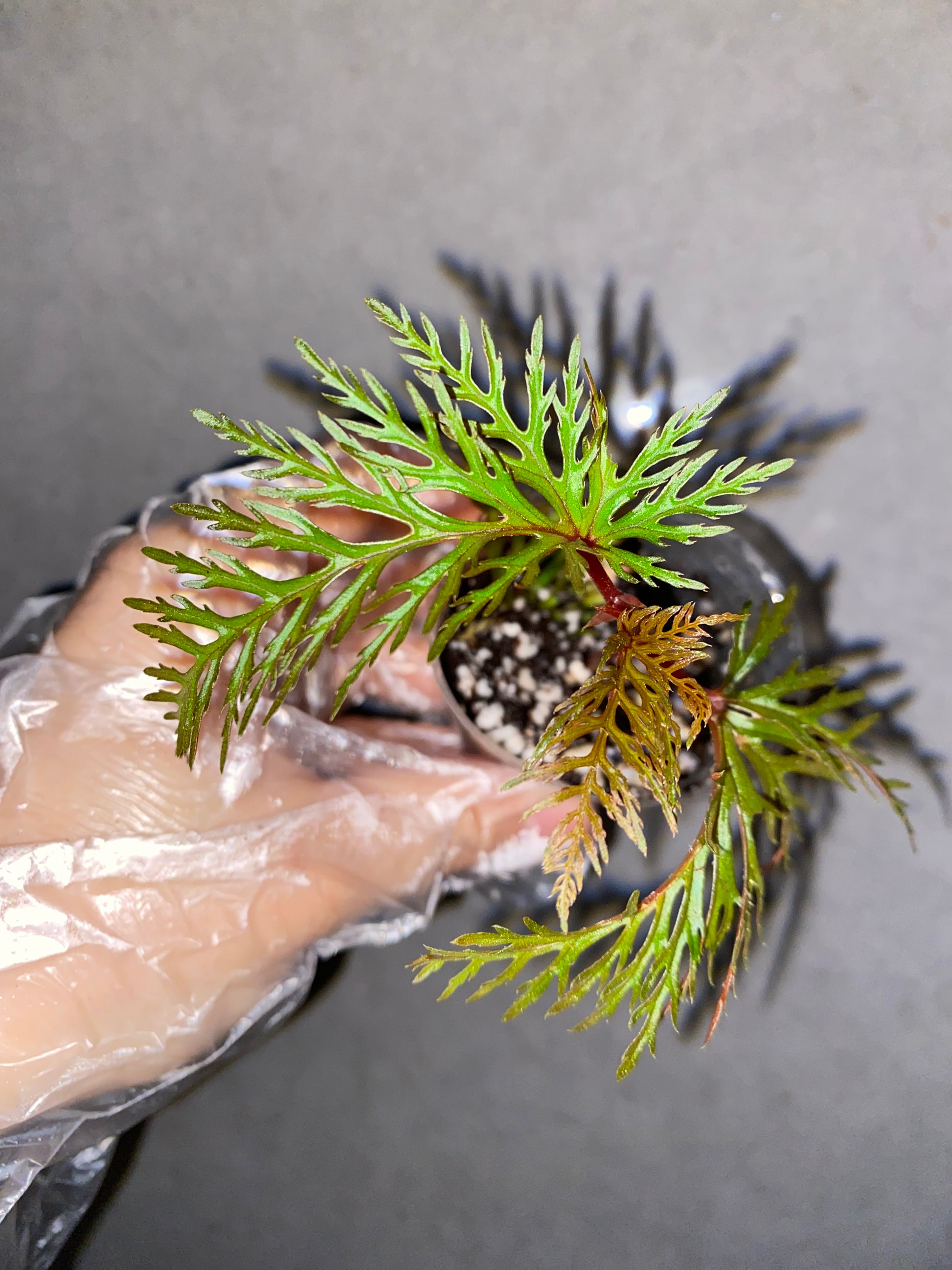 A rare and exotic Begonia species from New Guinea, admired for its deeply divided, fern-like foliage in shades of green and bronze. A true gem for collectors who love unusual leaf forms.