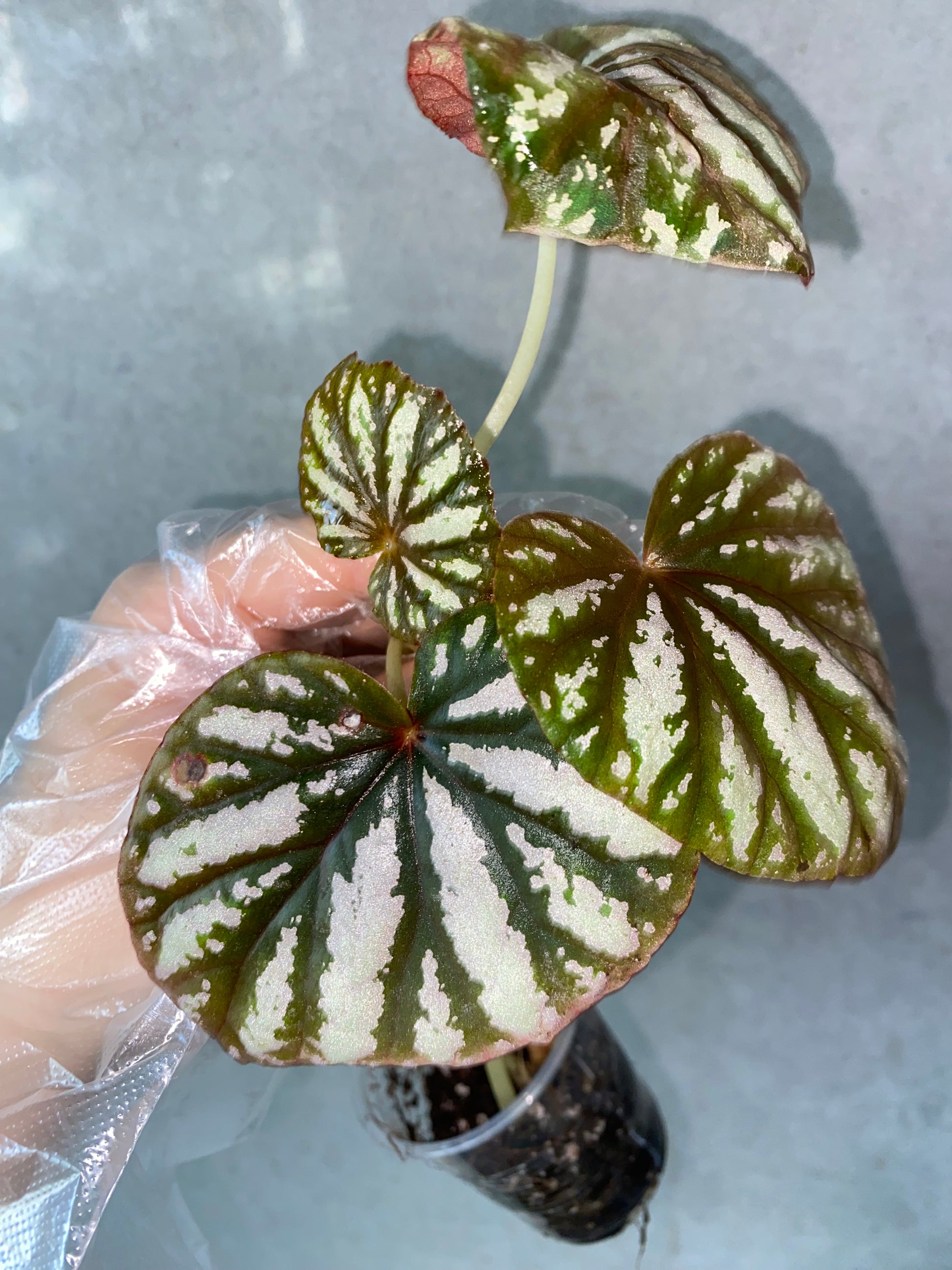 A charming compact Begonia with heart-shaped leaves splashed in silver and rose-red tones. Unique foliage pattern with collector appeal. Well rooted and actively growing. ๐ชด 3 leaves, strong and healthy ๐ก Bright indirect light, keep soil slightly moist