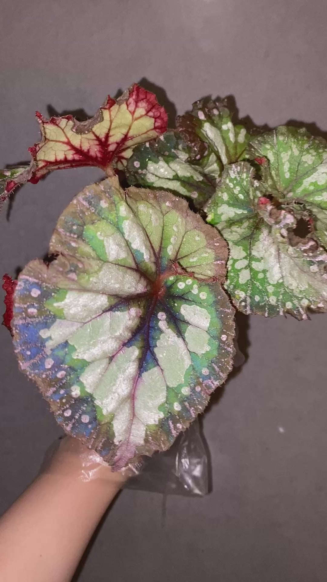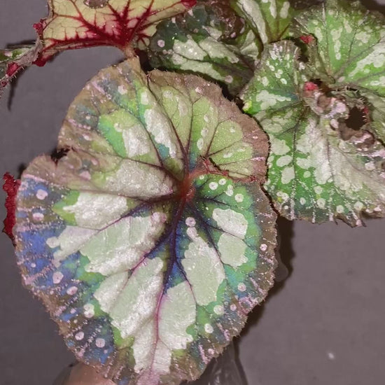 Vibrant and full of contrast โ bright green leaves dusted with silver, deep red veins, and textured edges. A festive and hardy rex cultivar. Well rooted and actively growing. ๐ชด 4+ leaves, established in soil ๐ก Bright indirect light, avoid soggy soil