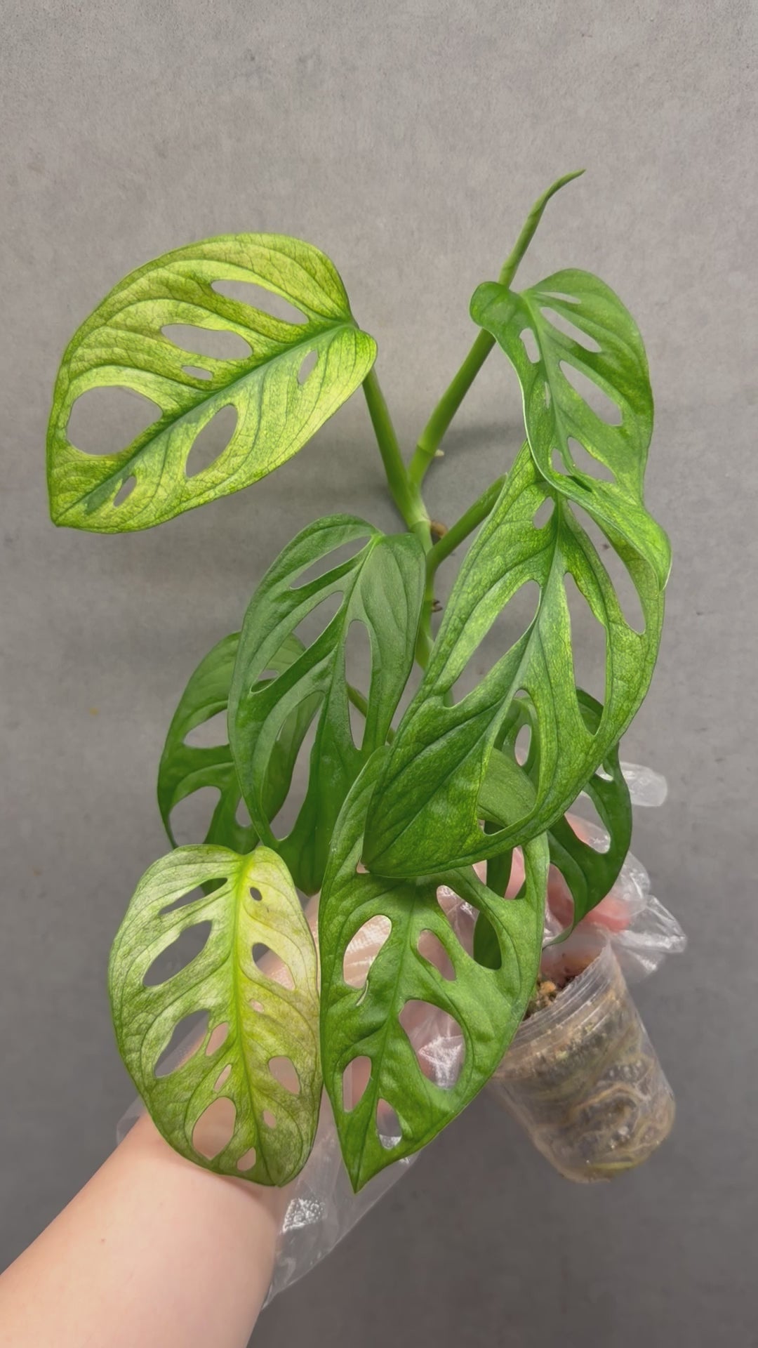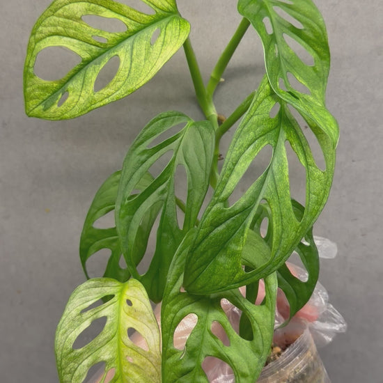 Rare form with beautiful whitewashed variegation across fenestrated leaves.