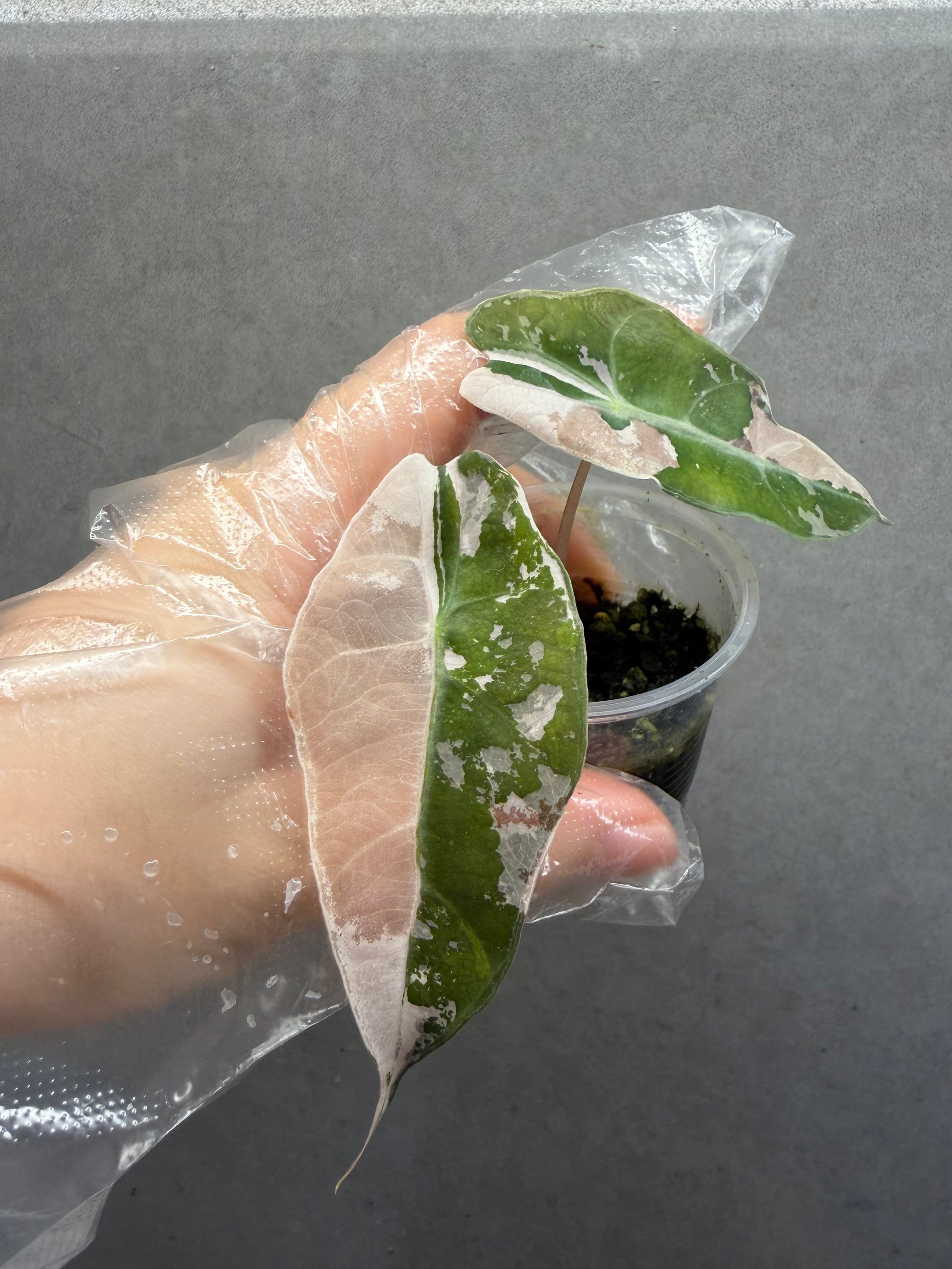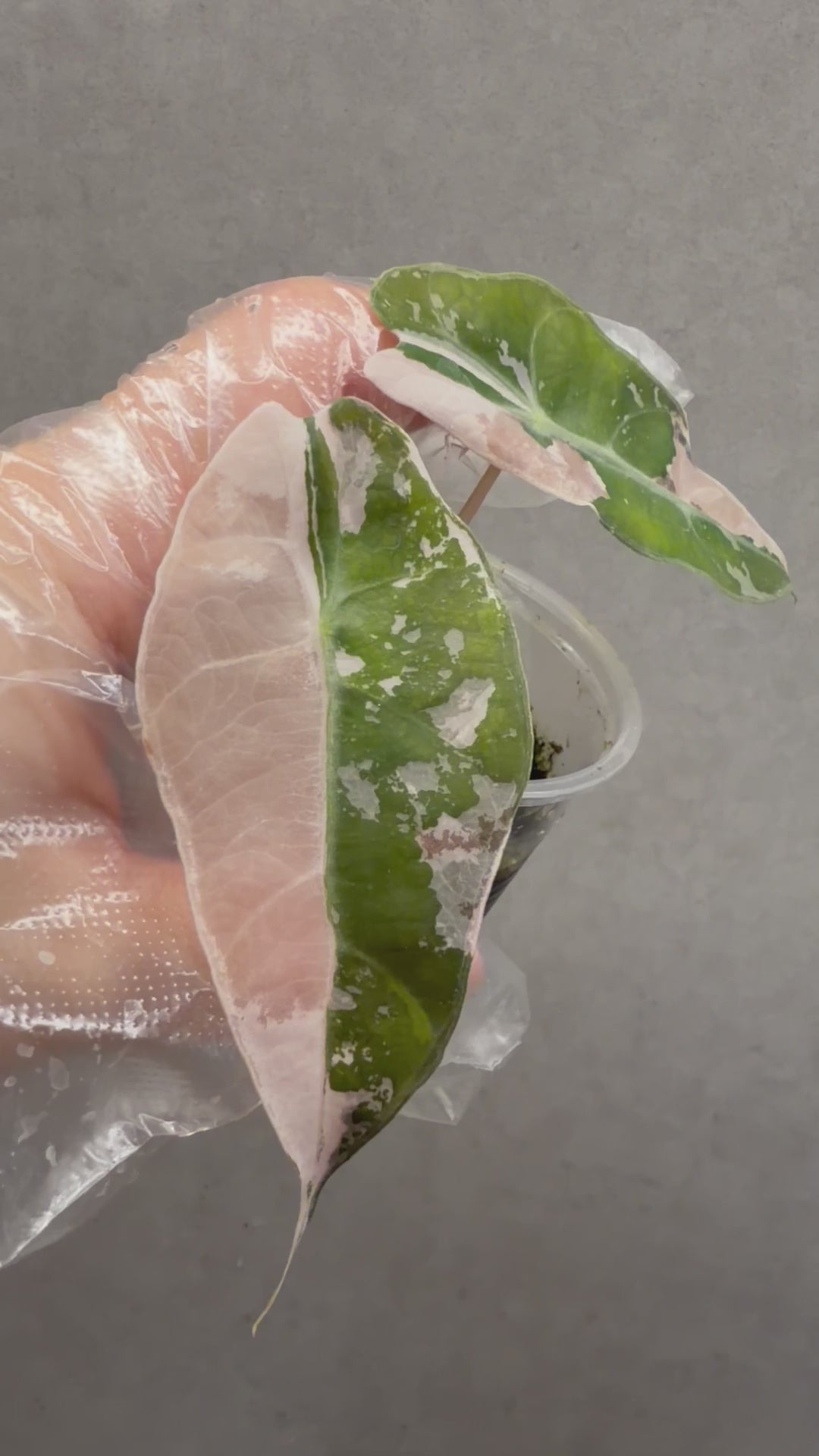 A stunning variegated form of the classic Alocasia Polly, showing creamy white to soft pink marbling across the leaves.