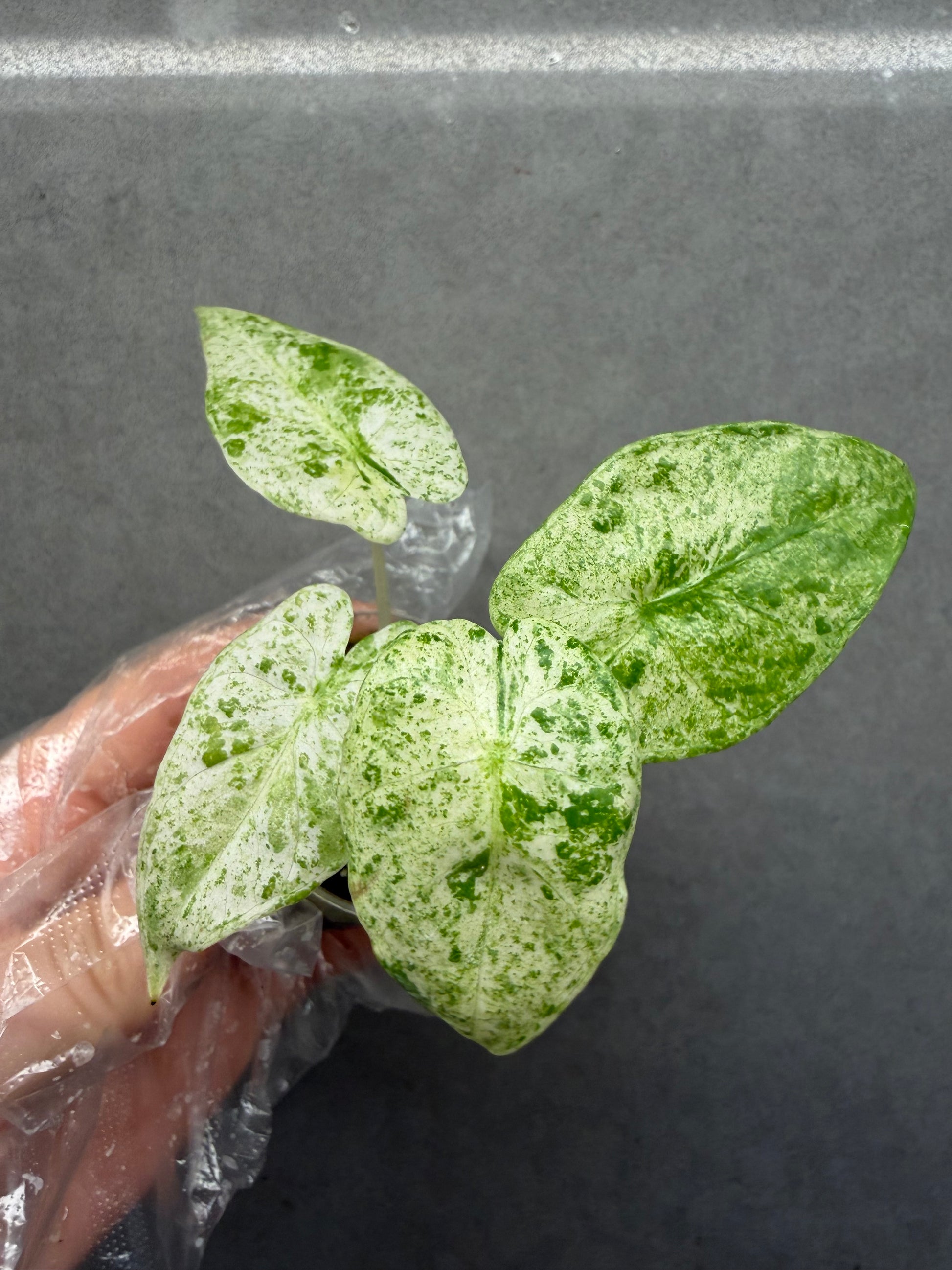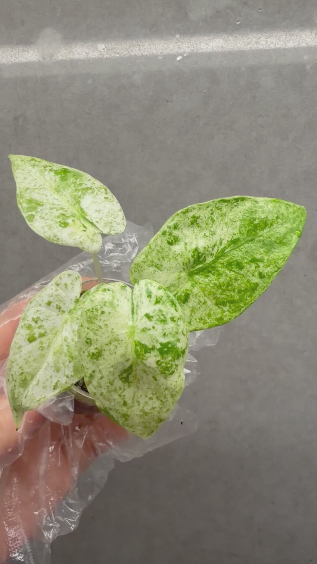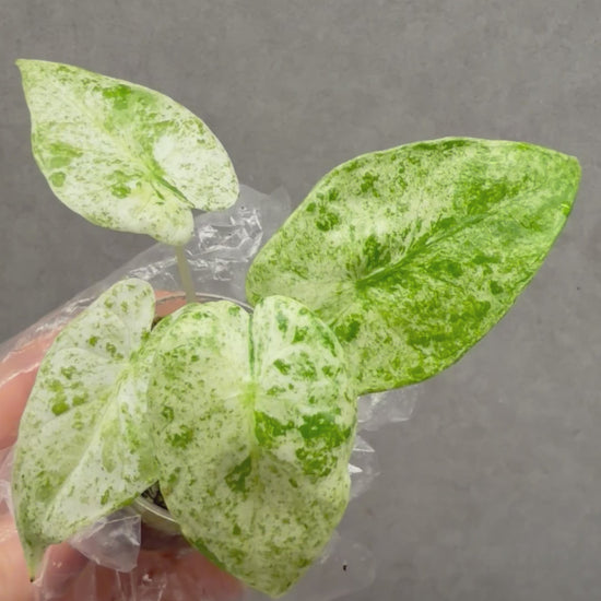 A rare variegated form featuring creamy white marbling and soft mint-green speckles, giving a snow-dusted appearance.