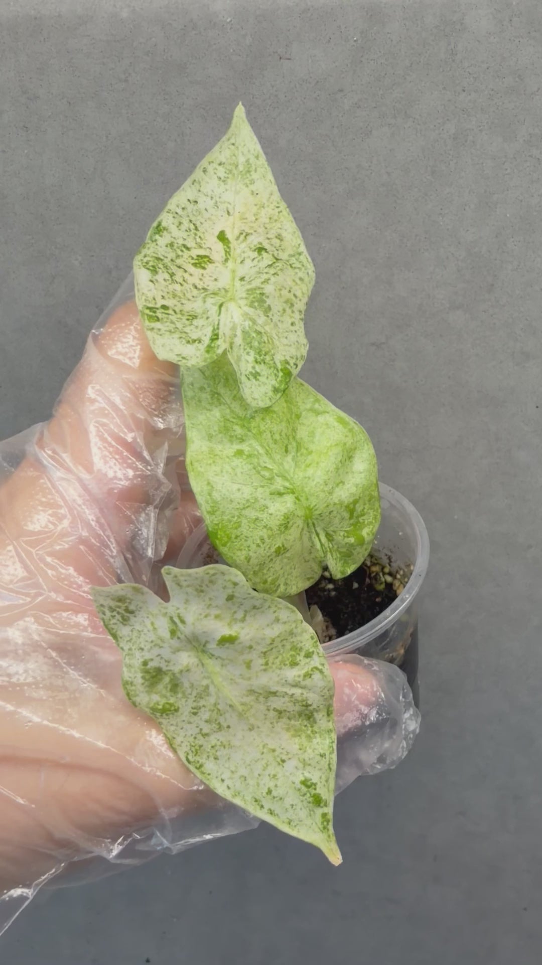 A rare variegated form featuring creamy white marbling and soft mint-green speckles, giving a snow-dusted appearance.