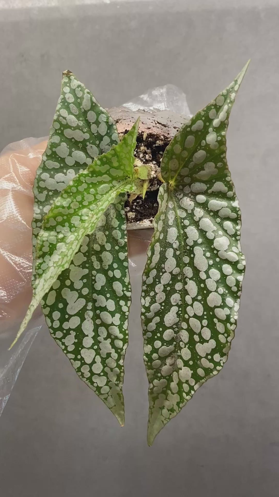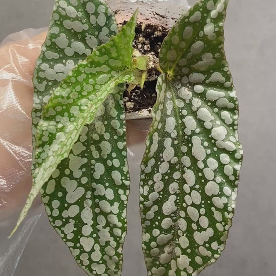 A charming Begonia with elongated green leaves dusted with shimmering silver-white polka dots — reminiscent of falling snow. Easy to care for and perfect for any collection.