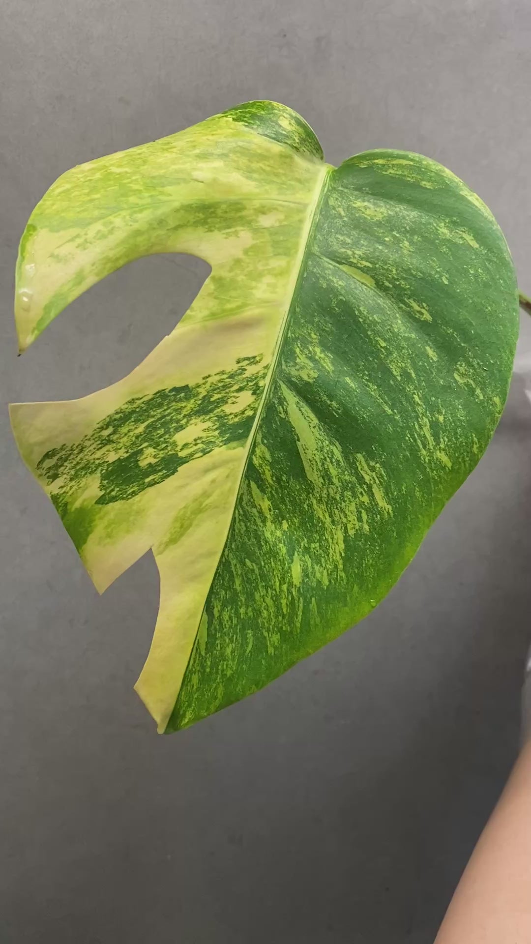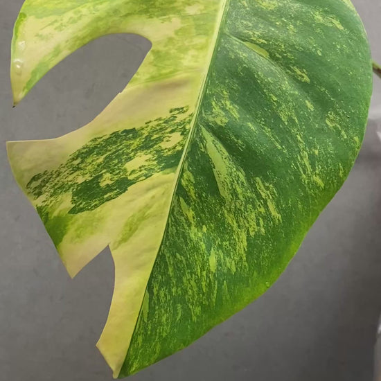 A rare variegated Monstera featuring golden-yellow marbling over deep green leaves.