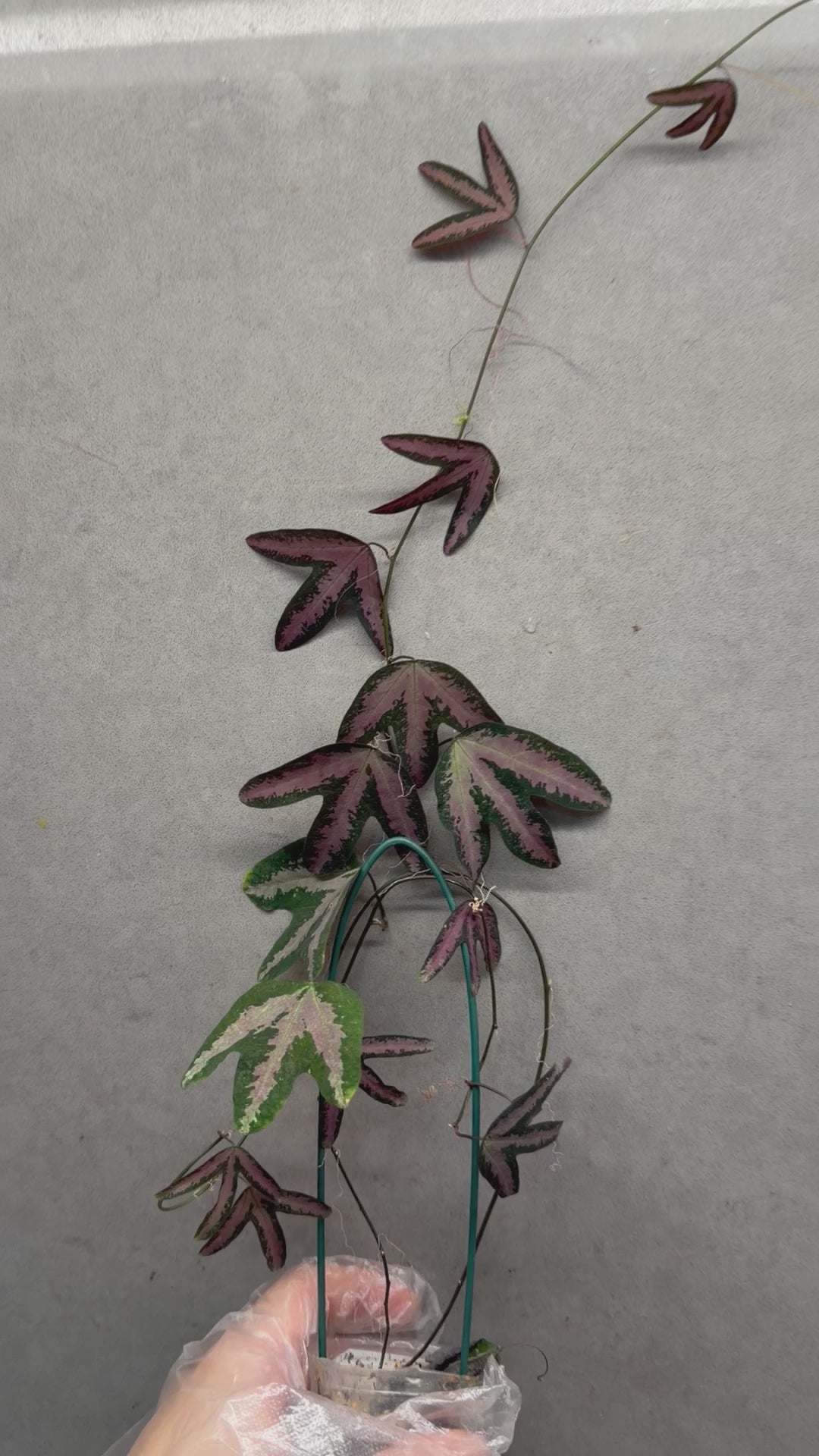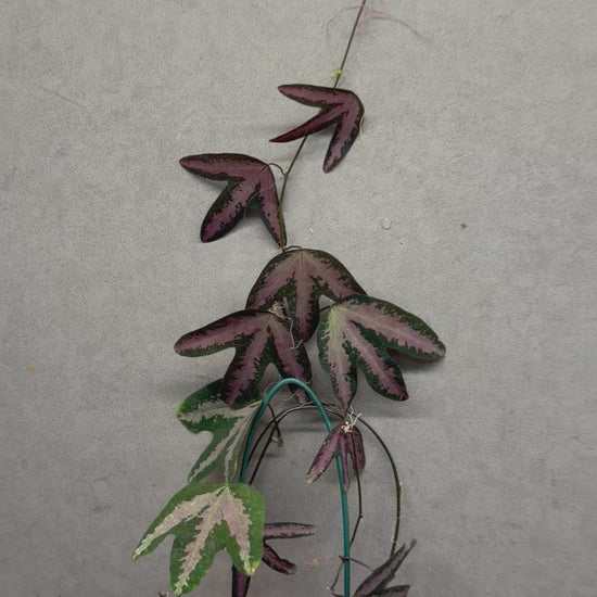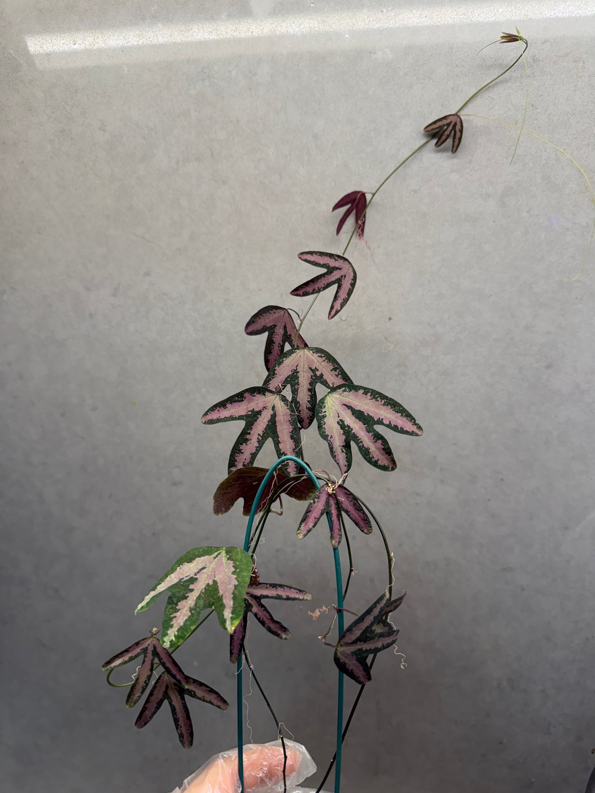 A rare and stunning passion vine with tricolor variegation — olive green, soft pink, and cream streaks beautifully contrast on each lobed leaf. Fast-growing and easy to trail or trellis, perfect for adding color and structure to your space.